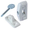 This metal window lock is fitted under the handle and flush to the frame by steel screws, the heads being covered when the window is closed