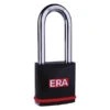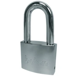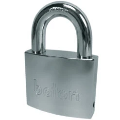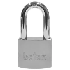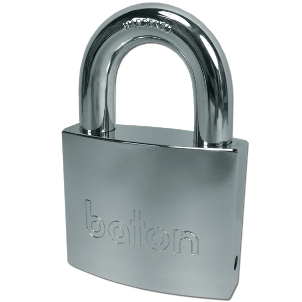 Baton 6020 Series padlock with disc detainer high security locking system. A Maxi-Security solid brass padlock with a chrome plated body for great weather protection. These high security padlocks use two ball bearings to lock the shackle in place and use disc detainer locking technology along with a half moon style key.