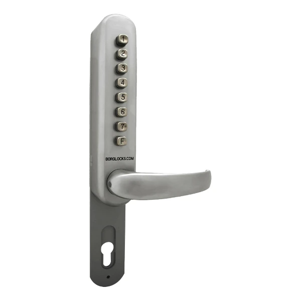 Borg Lock BL6100 digital push button lock with a narrow case that makes it suitable for UPVC doors. The handle has a limited 70° handle rotation which operates well with UPVC mechanisms, the handles also incorporates a clutched keypad handle that stops force attack and offers no resistance until the correct code is entered. The thin keypad has just 8 buttons, but has a unique system that allows a digit to be used twice.