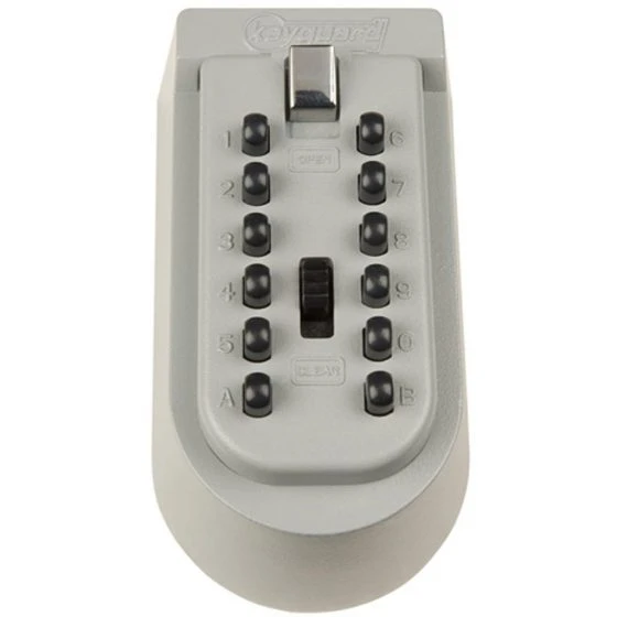 Keyguard Digital Push Button Key safe from Burtonsafes, a low cost solution to storage for keys for access to a property. This Keyguard can store keys up to 80mm in length in a bunch size of 4-5 cylinders Yale types keys or 1-2 mortice Chubb type keys. To gain entry to the Keyguard Keysafe, the user enters the 4-8 digit code, the pull down on the metal release catch at the top. Once the keys have been retrieved, the front panel is placed back in place and secured. This style of Key Safe with push buttons is more secure than dial combinations as there is no chance the access code can be left displayed on the unit.