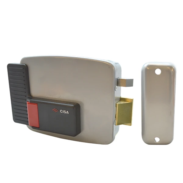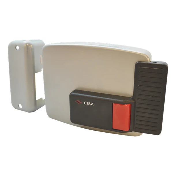 CISA 11610 Series Electric Rim Lock for Internal Wooden Doors, internal manual exit button, grey finish, fail locked