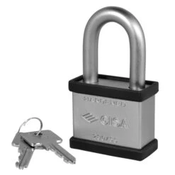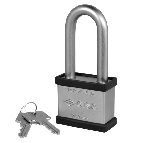 Open, long and protected shackle versions. Solid hardened steel body. Hardened steel shackle. Key withdrawal only when locked. Rekeyable cylinder