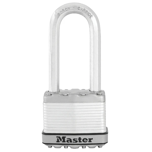 This is the Long Shackle version of the Master Lock Excell laminated padlocks and shares all the security features of the standard laminated padlocks, but with the increased useability of a long shackle. As with all Master Lock Excell padlocks, the shackle is made of boron-carbide and comes in an Octagonal shape, this makes the 9mm shackle 50% harder than standard hardened steel. The body of the padlock is 52mm and the shackle has a diameter of 9mm.Â
