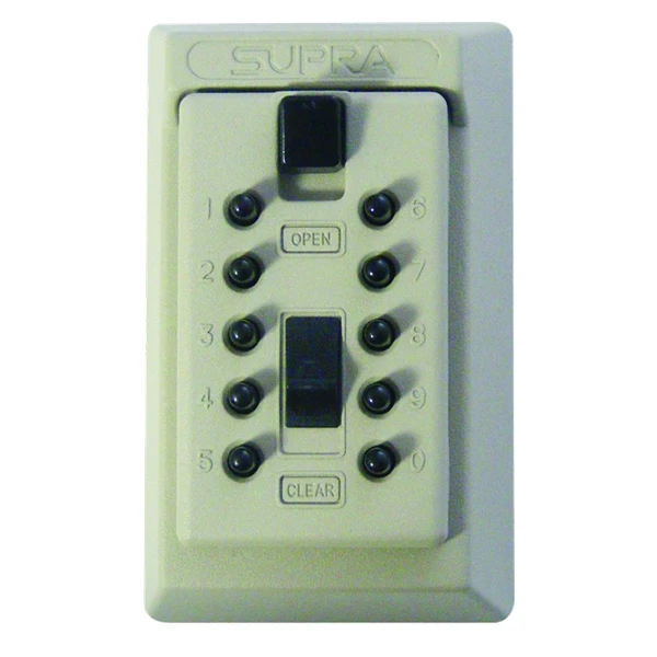 Slide the ‘Clear’ switch down to reset the buttons. Push the appropriate combination code. Press down the ‘Open’ switch and remove the lid. After use of the key, enter the code again, press down the ‘Open’ button and place the lid back. Release the ‘Open’ button and the lid will be locked.